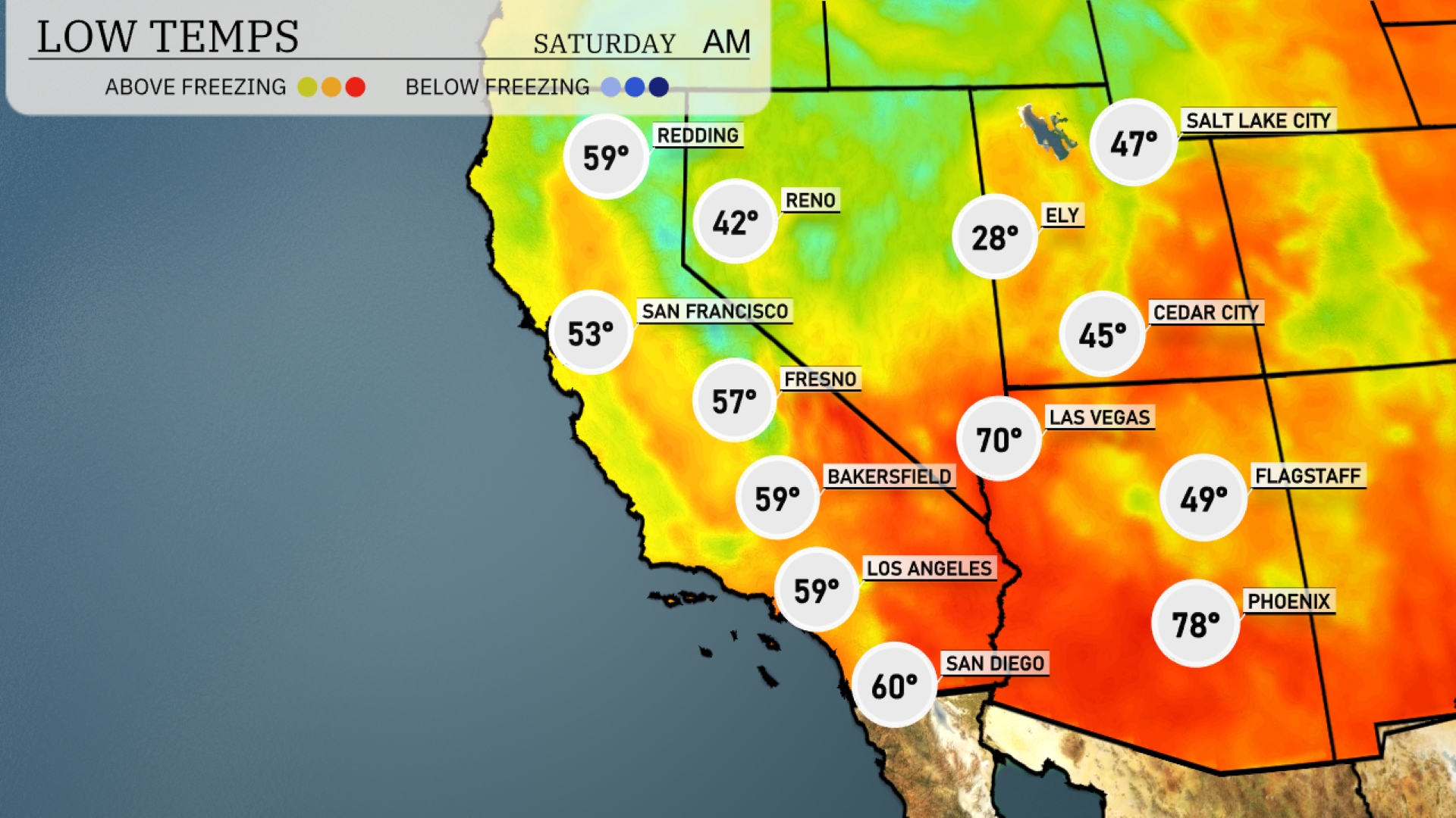 Tonight in the Southwest, Ely is experiencing a significant drop to 28 degrees, making it the coldest spot in the region. Las Vegas will see a low of 70 degrees, while Flagstaff is expected to cool down to 49. In contrast, Phoenix will remain much warmer at 78 degrees, maintaining their mild conditions compared to other areas.