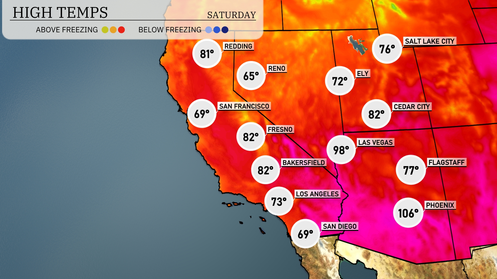 Tomorrow in Phoenix, expect a scorching high of 106 degrees, significantly above average for this time of year. Las Vegas will also see notable heat, with temperatures soaring to 98 degrees. As we move west, Bakersfield and Fresno are both projected to reach 82 degrees, while San Diego stays cooler at 69 degrees. The high in Los Angeles will hit 73 degrees.
