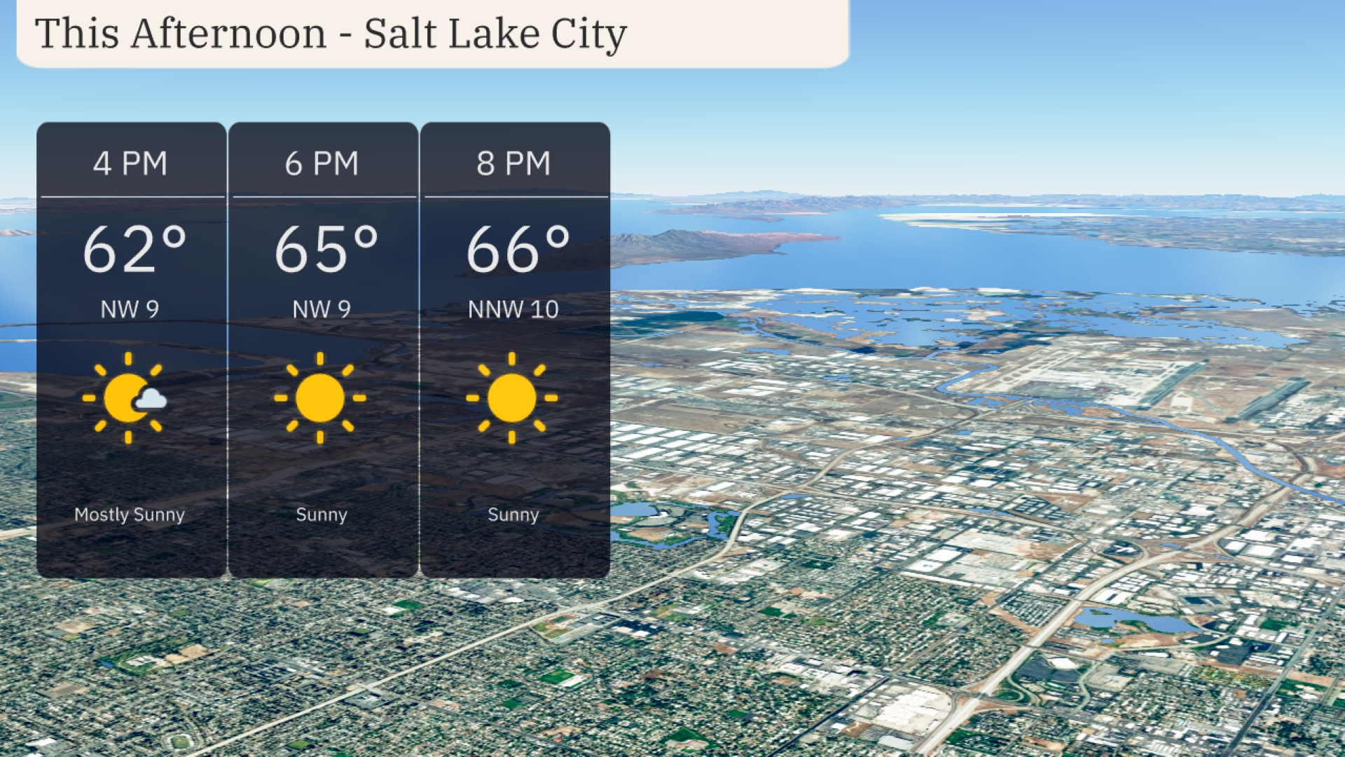 Salt Lake City this afternoon sees temperatures climbing from 62 degrees at 4 PM to 66 degrees by 8 PM. Mostly sunny skies dominate earlier in the afternoon, transitioning to clear conditions later on. Expect a gentle breeze from the northwest at around 9 to 10 miles per hour throughout the afternoon.