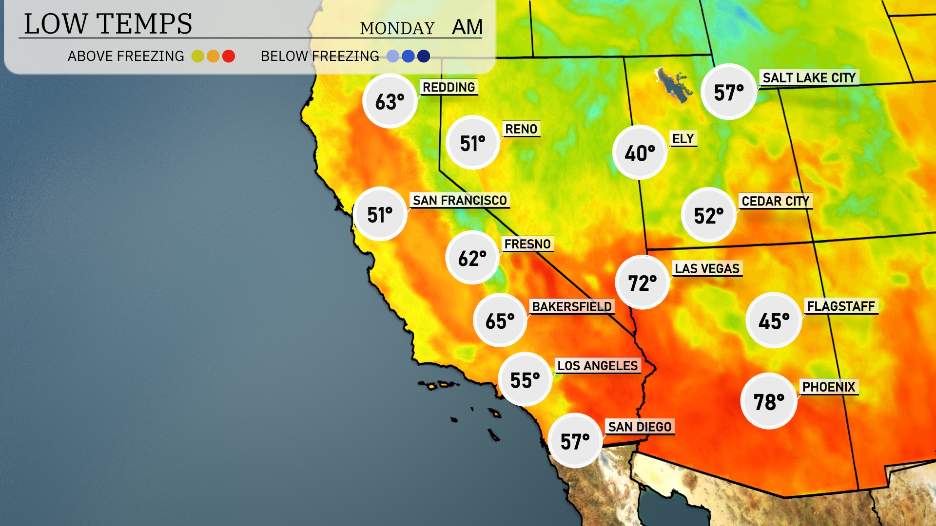 Tomorrow in Phoenix, expect a scorching high of 103 degrees, significantly above average for this time of year. Las Vegas will also see the heat, with temperatures reaching 96 degrees. In Bakersfield, Calif., the high is anticipated to hit 91 degrees, while Fresno will warm up to 92. Farther west, San Diego will experience a milder day with a high of 70 degrees, offering a cooler contrast.