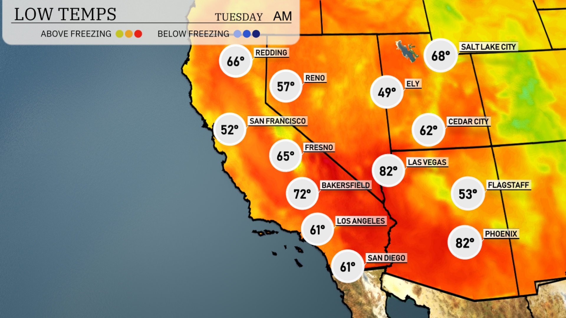 Tonight in the Southwest, expect a low of 49 degrees in Ely. Las Vegas will cool down to 62 degrees, while Fresno is set for a low of 65. San Francisco will see a mild evening at 52 degrees, and Bakersfield will rest at 72 degrees.