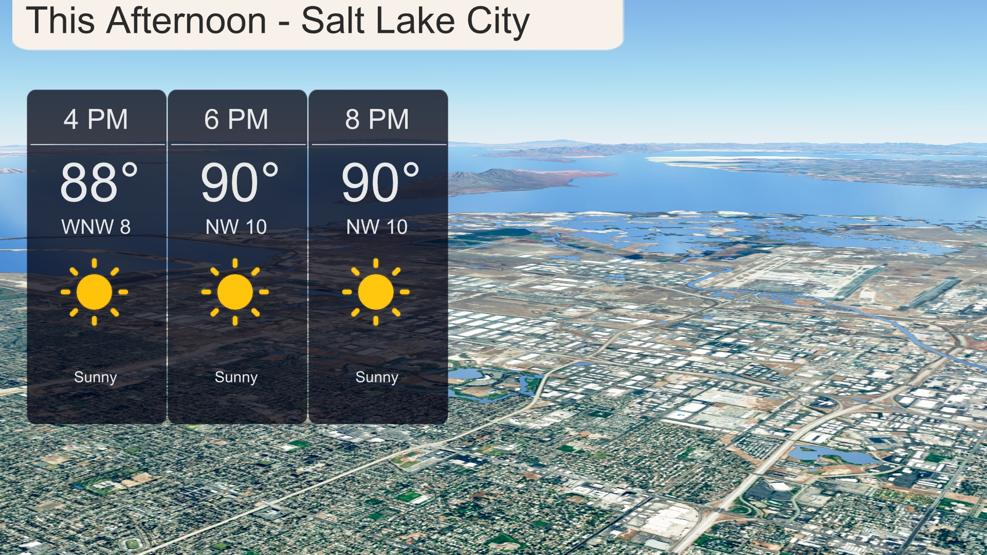 Afternoon temperatures in Salt Lake City will rise to 88 degrees by 4 PM and peak at 90 degrees by 6 PM, with clear skies and ample sunshine. A light breeze from the west-northwest at 8 to 10 miles per hour will offer some relief from the heat. Skies will remain sunny, maintaining a dry and warm pattern into the early evening.