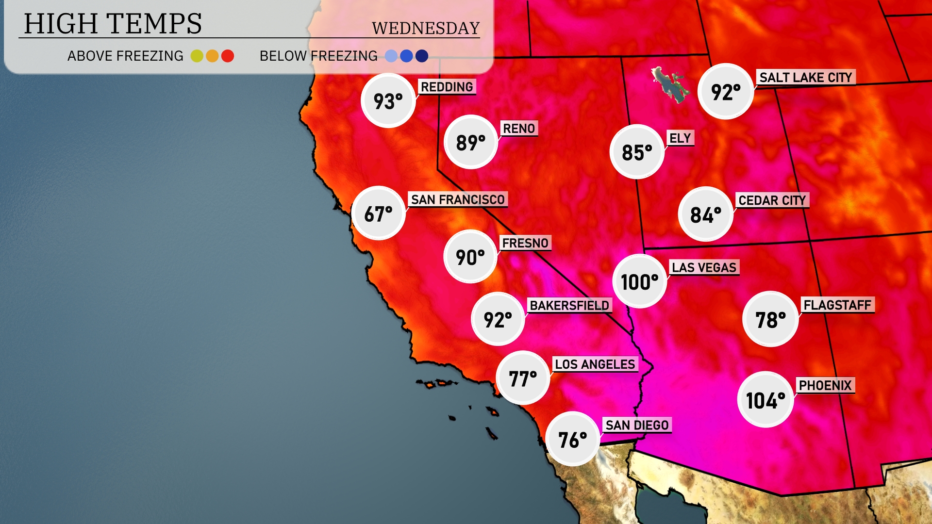 Tomorrow in Phoenix, prepare for a scorching high of 106 degrees, well above the average for this time of year. Las Vegas will also experience a significant warm-up, reaching 101 degrees. In Bakersfield, temperatures will climb to 92 degrees, while Fresno will not be far behind at 90 degrees. San Diego will see a more moderate high of 77 degrees, providing some relief from the intense heat inland.