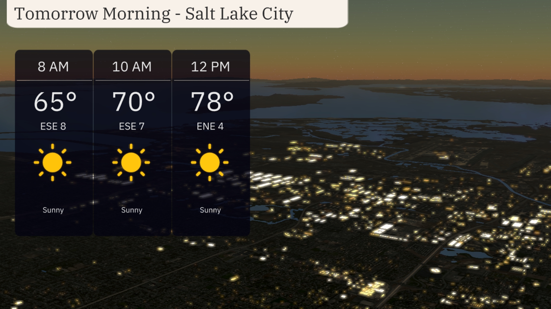 Tomorrow morning in Salt Lake City, temperatures begin at 65 degrees at 8 AM, climbing to a pleasant 70 degrees by 10 AM. The skies will remain sunny throughout the morning hours. Expect an east-southeast wind around 8 AM at 8 miles per hour, calming to 7 miles per hour by 10 AM before shifting to an east-northeast breeze at 12 PM.
