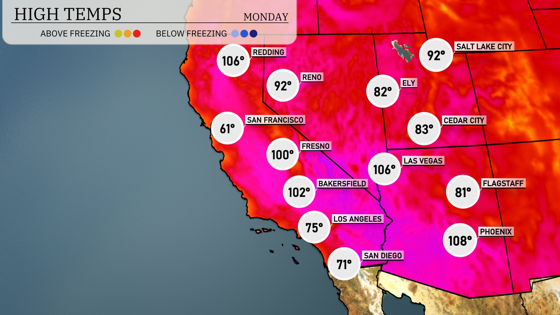 Tomorrow in Phoenix, expect a sizzling high of 108 degrees. Las Vegas will also feel the heat with temperatures reaching 106. In Bakersfield, highs hit 102, while Fresno warms up to 100. San Diego will be more temperate at 75 degrees, presenting a stark contrast to inland temperatures.