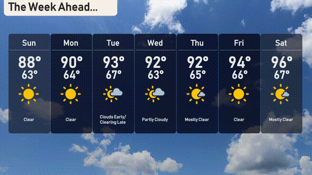 For Salt Lake City, here’s your 7-day forecast: Sunday: Clear skies dominate with a high of 88 degrees and a low of 63 degrees. Monday: Another clear day with temperatures climbing to a warm 90 degrees, with a low of 64 degrees. Tuesday: Clouds early, clearing late with a high reaching 93 degrees and a low around 67 degrees. Wednesday: Partly cloudy conditions as temperatures hit 92 degrees during the daytime and 63 degrees overnight. Thursday: Mostly clear skies with a high of 92 degrees and a low of 65 degrees. Friday: Expect sunny weather with the temperature rising to a high of 94 degrees and dipping to 66 degrees at night. Saturday: Mostly clear again as temperatures soar to 96 degrees with a low of 67 degrees.
