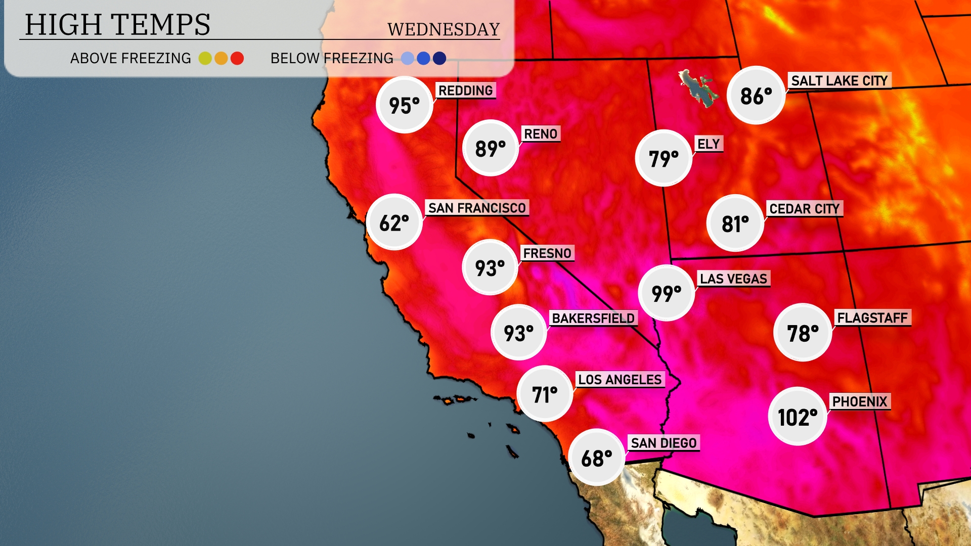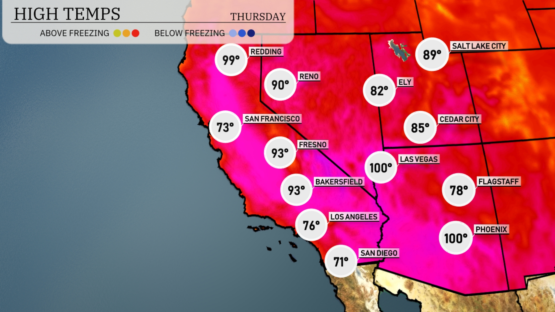 High temperatures in the Southwest are set to soar above average tomorrow. Las Vegas and Phoenix will both reach a scorching 100 degrees. In California, Bakersfield and Fresno are expected to hit 93 degrees, while Los Angeles will see a more moderate high of 76 degrees. San Diego will enjoy a pleasant day, with temperatures peaking at 71 degrees. Teno is forecasted for a high of 90 degrees, contributing to the general warmth across the region.