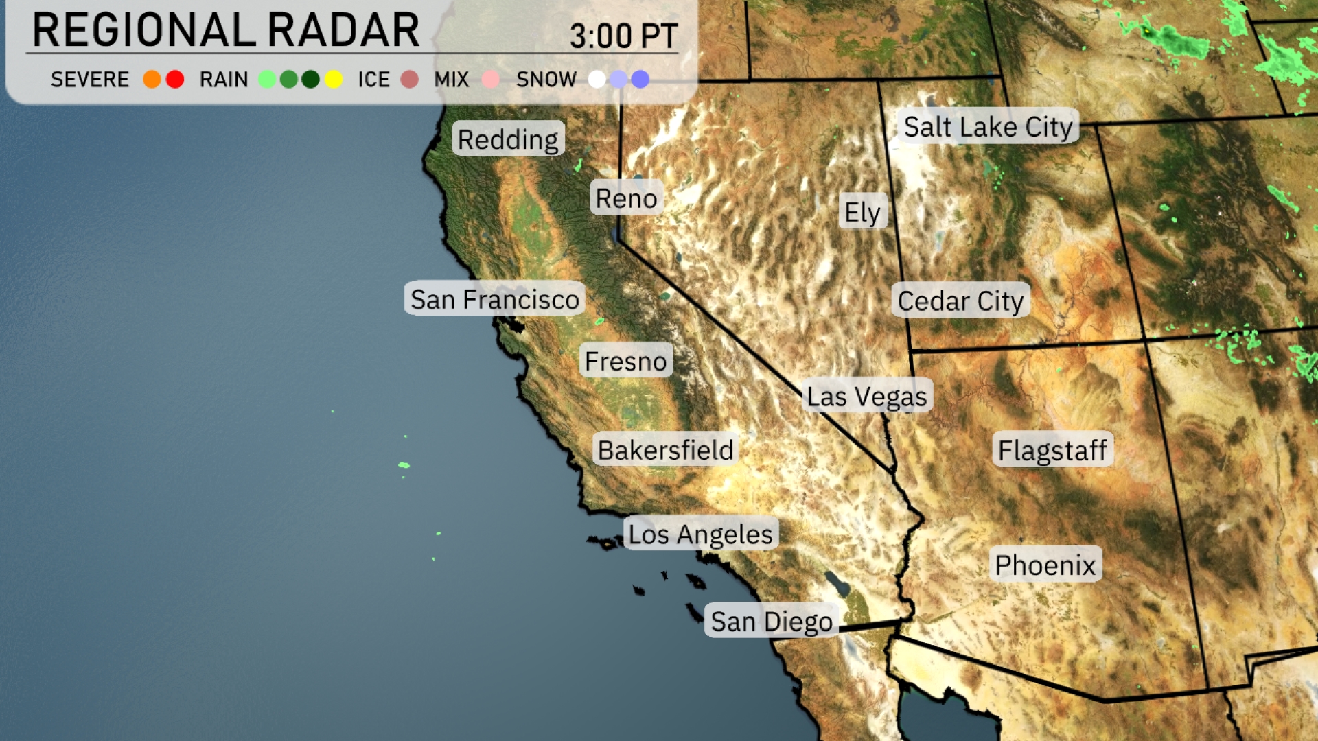 On the Regional Radar, a band of rain is moving through California, impacting areas from San Francisco down to Los Angeles, bringing much-needed moisture to these regions. Snow is blanketing higher elevations, including regions near Reno and areas just to the west of Ely, creating the potential for travel disruptions in mountainous areas. In San Diego and Los Angeles, showers offer relief amidst mild temperatures, while Phoenix and Las Vegas continue to experience dry conditions. Cloud cover is increasing in the Salt Lake City area, indicating a possible shift in weather patterns. The skies remain clearer over Cedar City, allowing for a relatively calm start to the evening.