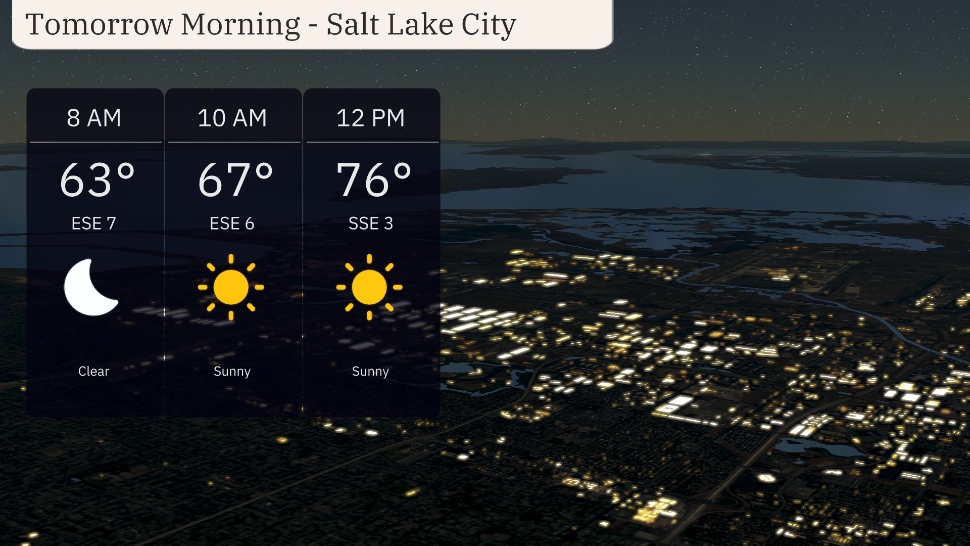 Tomorrow morning in Salt Lake City begins with clear skies and a temperature of 63 degrees at 8 AM. As the morning progresses, expect the sunshine to stay with us, bringing temperatures up to 67 degrees by 10 AM and reaching 76 degrees by noon. Winds are light throughout the morning, starting from the east-southeast at 7 miles per hour at 8 AM, easing up slightly to 6 miles per hour by 10 AM, and shifting south-southeast at 3 miles per hour by noon.