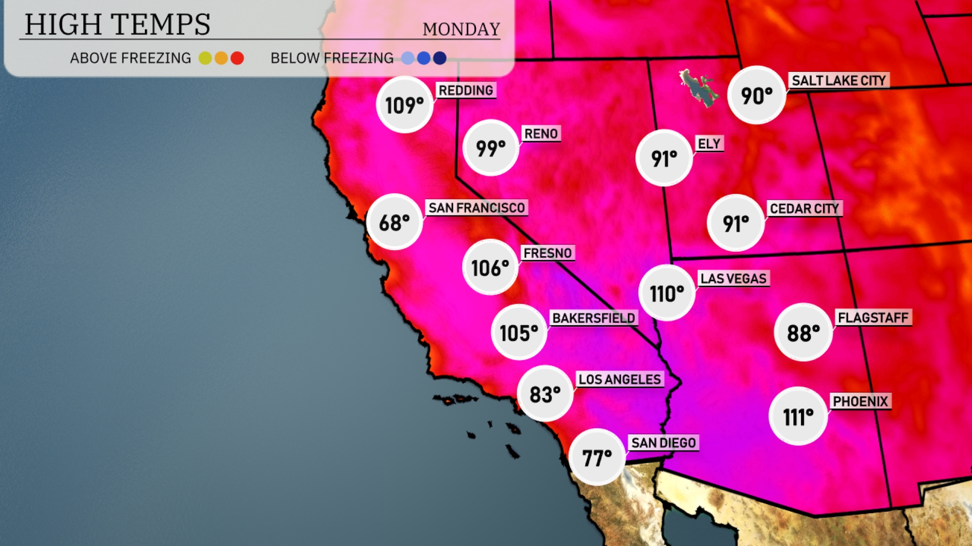 Monday: Partly cloudy with a warm-up to 90 degrees and a nighttime low of 65 degrees.