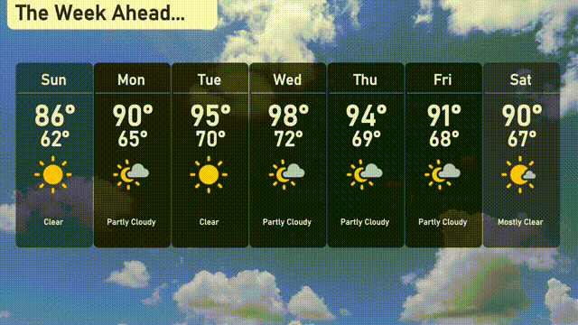 Thursday: Slightly cooler with partly cloudy skies, a high of 94 degrees and a low of 69 degrees.