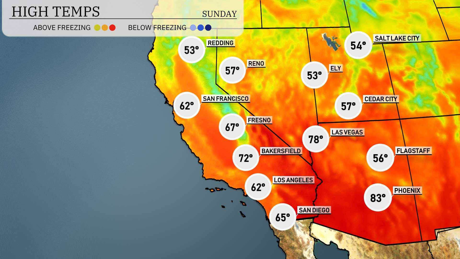 To the west in Los Angeles, expect a high of 62 degrees, which is a bit cooler than usual, while San Diego will be slightly warmer at 65 degrees. Up north in Fresno, temperatures will warm up to 67 degrees, and Bakersfield is set for a high of 72 degrees.