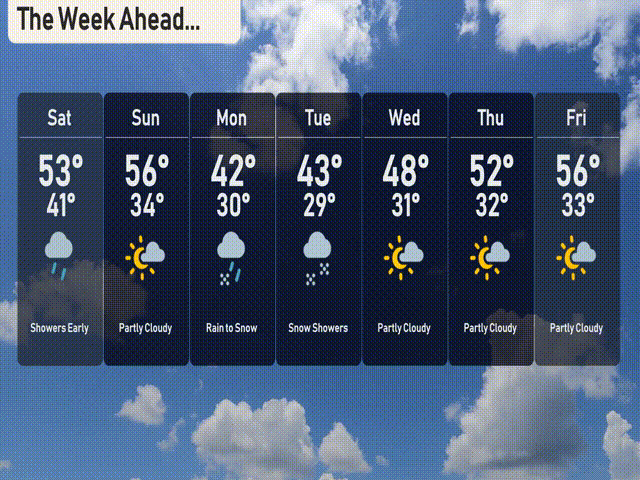 Saturday: Expect showers early with a high of 53 degrees and a low of 41.