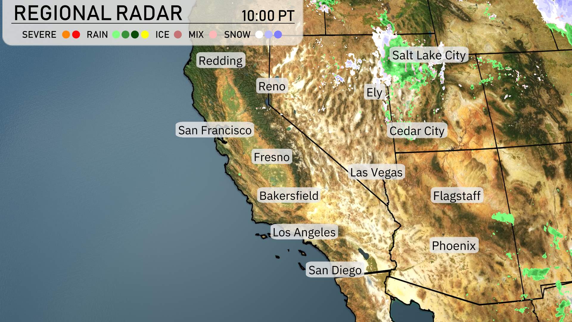 Today across the Southwest, the regional radar is showing a mix of weather patterns. A band of precipitation is making its presence felt across the intermountain west wher light snow showers are currently occurring in the higher elevations. The valleys get cold rain.