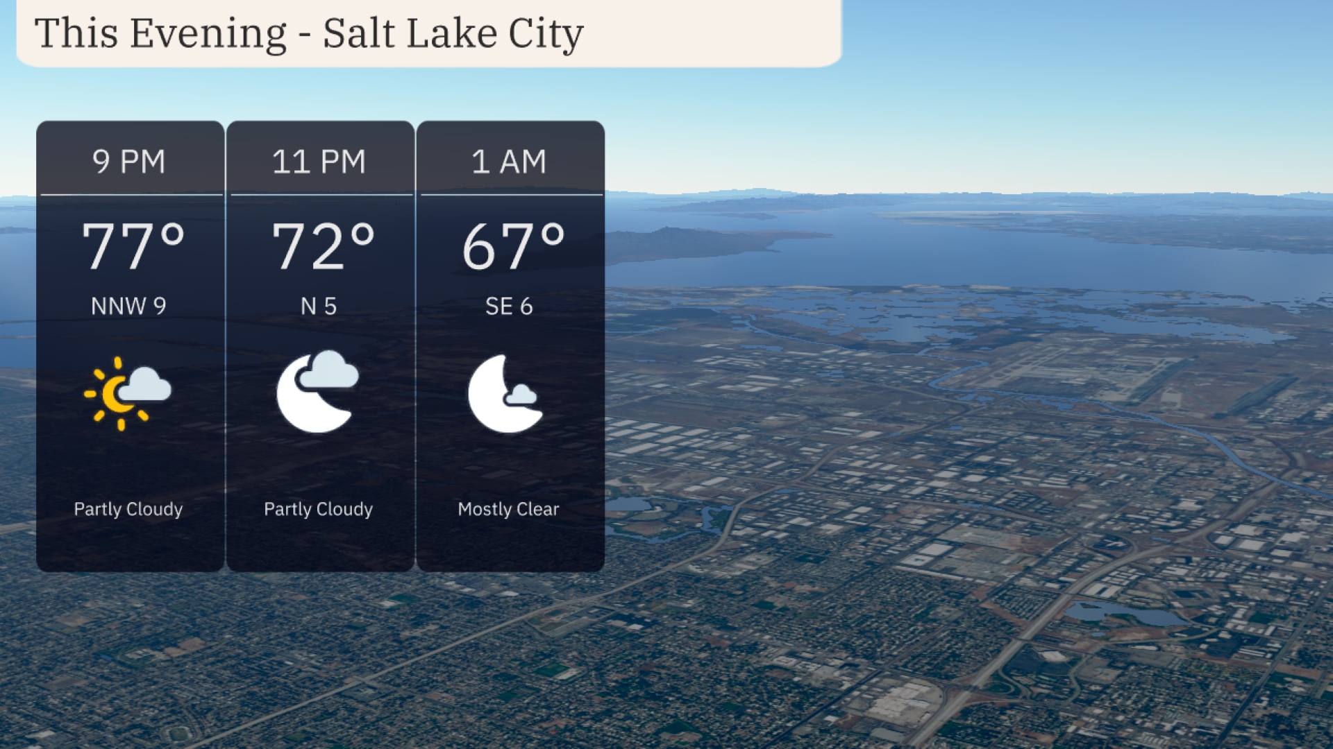 In the evening hours for Salt Lake City, the temperature will start at 77 degrees at 9 PM, cooling to 72 degrees by 11 PM, and reaching a low of 67 degrees by 1 AM. Expect partly cloudy skies initially, transitioning to mostly clear conditions later. Winds will shift from northwest at 9 mph earlier in the evening to southeast at 6 mph by 1 AM.