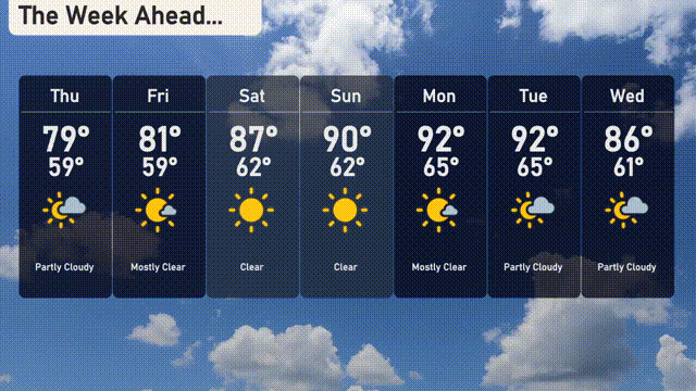 For the 7-day outlook in Salt Lake City: Thursday: Partly cloudy with a high of 79 degrees and a low of 59 degrees. Friday: Mostly clear skies, warmer with a high of 81 degrees and a low of 59 degrees. Saturday: Sunny day expected with temperatures rising to a high of 87 degrees and a low of 62 degrees. Sunday: Clear skies continue, reaching a high of 90 degrees, and cooling to 62 degrees at night. Monday: Mostly clear with the week’s high at 92 degrees, low dipping to 65 degrees. Tuesday: Partly cloudy skies, staying warm with a high of 92 degrees and a low of 65 degrees. Wednesday: Expect partly cloudy conditions, with temperatures reaching up to 86 degrees and a low around 61 degrees.