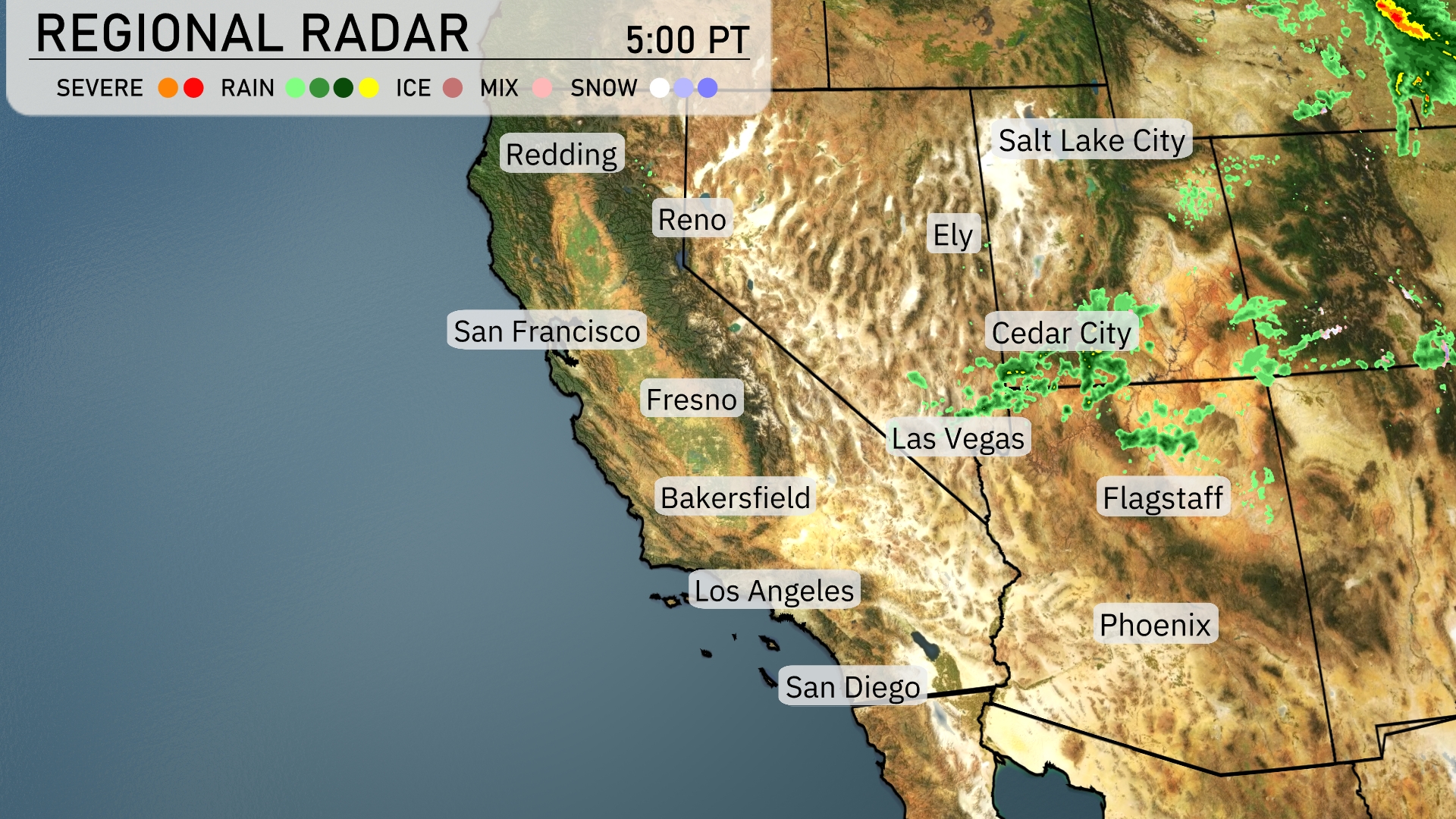 The regional radar shows clear conditions over much of the Southwest, with the exception of some showers in the northern reaches. In the Salt Lake City area, light rain is moving through, extending southeast toward Cedar City. Ely is experiencing some scattered showers as well. Most of the region, including Reno, Las Vegas, Phoenix, and the coastal cities such as San Francisco, remains dry and clear.
