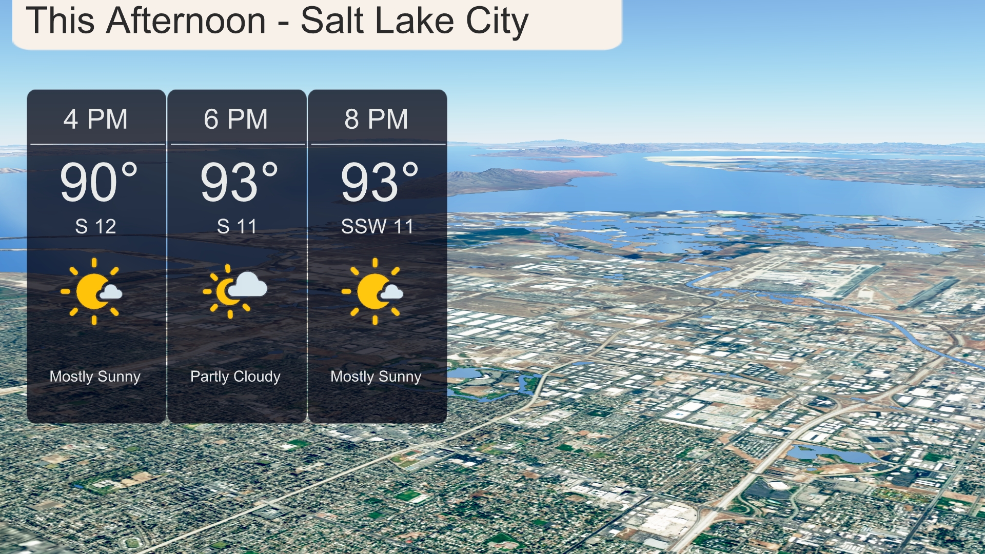 Salt Lake City this afternoon is heating up with temperatures climbing to 93 degrees by 6 PM. A steady south wind at 12 miles per hour continues through the afternoon, shifting slightly southwest by 8 PM. Mostly sunny skies will dominate, with a brief period of partly cloudy conditions early this evening.