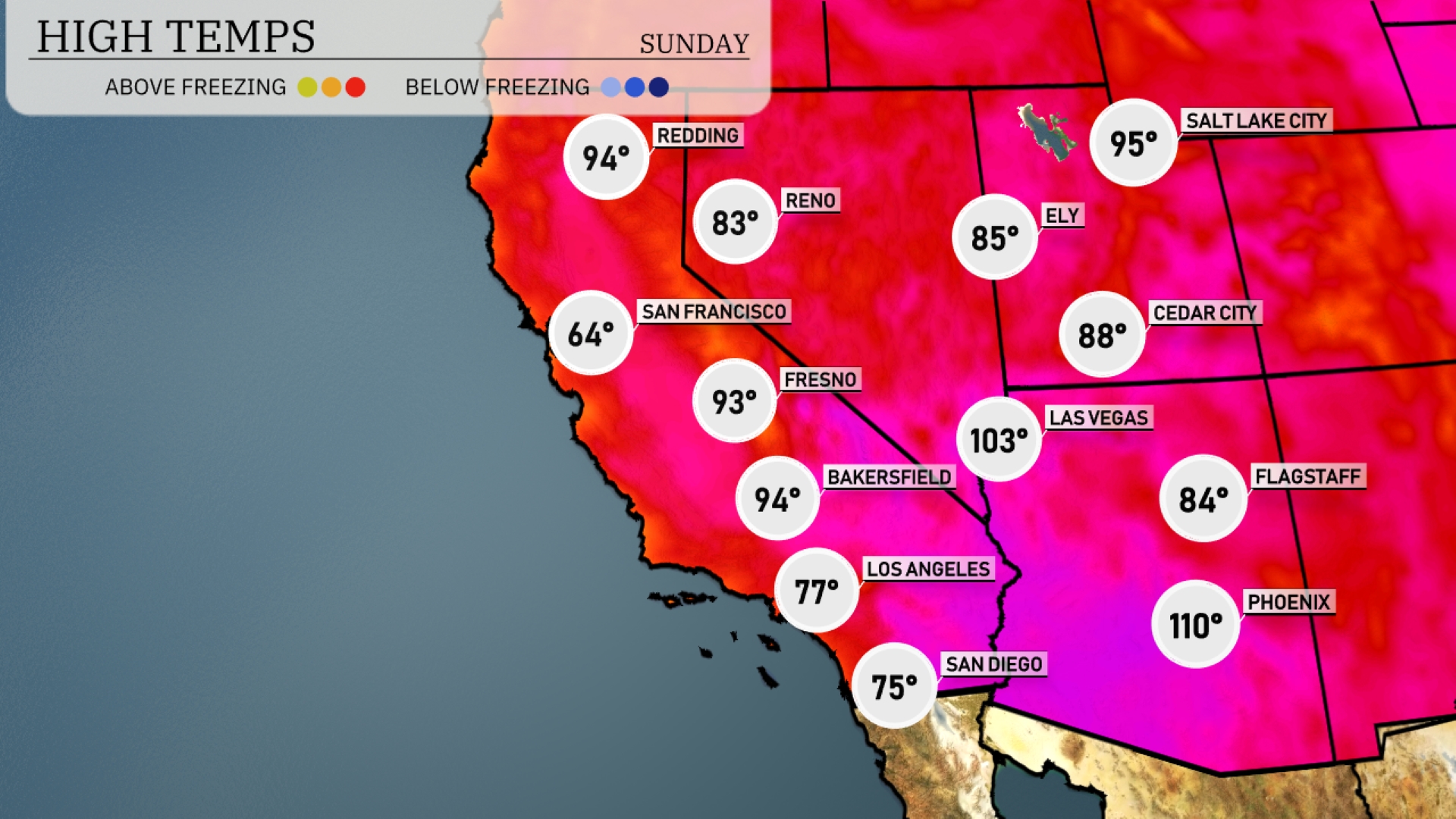 Tomorrow in Phoenix, prepare for scorching heat with a high of 113 degrees, significantly above average. Las Vegas is not far behind, expecting to reach 106 degrees, also above typical July readings. In contrast, San Diego will have a more moderate high of 76 degrees, keeping it comfortable along the coast. Further inland, temperatures in Bakersfield and Fresno will peak at 96 degrees, highlighting the overall warm trend in the region. Meanwhile, San Francisco will be cooler at 66 degrees, well below the warmer areas to the south and east.