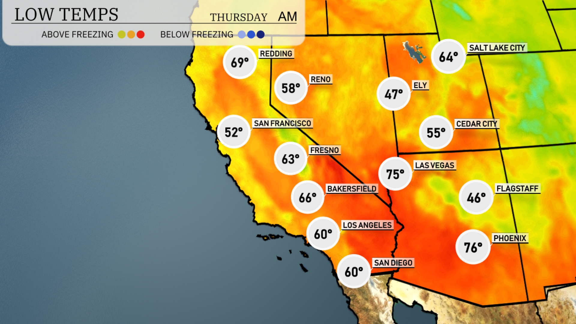 Low temperatures tonight in the Southwest will bring a significant chill. Las Vegas will dip to 55 degrees, while Phoenix remains warmer at 76. Flagstaff is expecting a brisk 46 degrees, highlighting the cold air mass settling in. In Southern California, San Diego will see a low of 60 degrees, with Los Angeles close behind at 60 as well. Bakersfield will experience a low of 66 degrees.