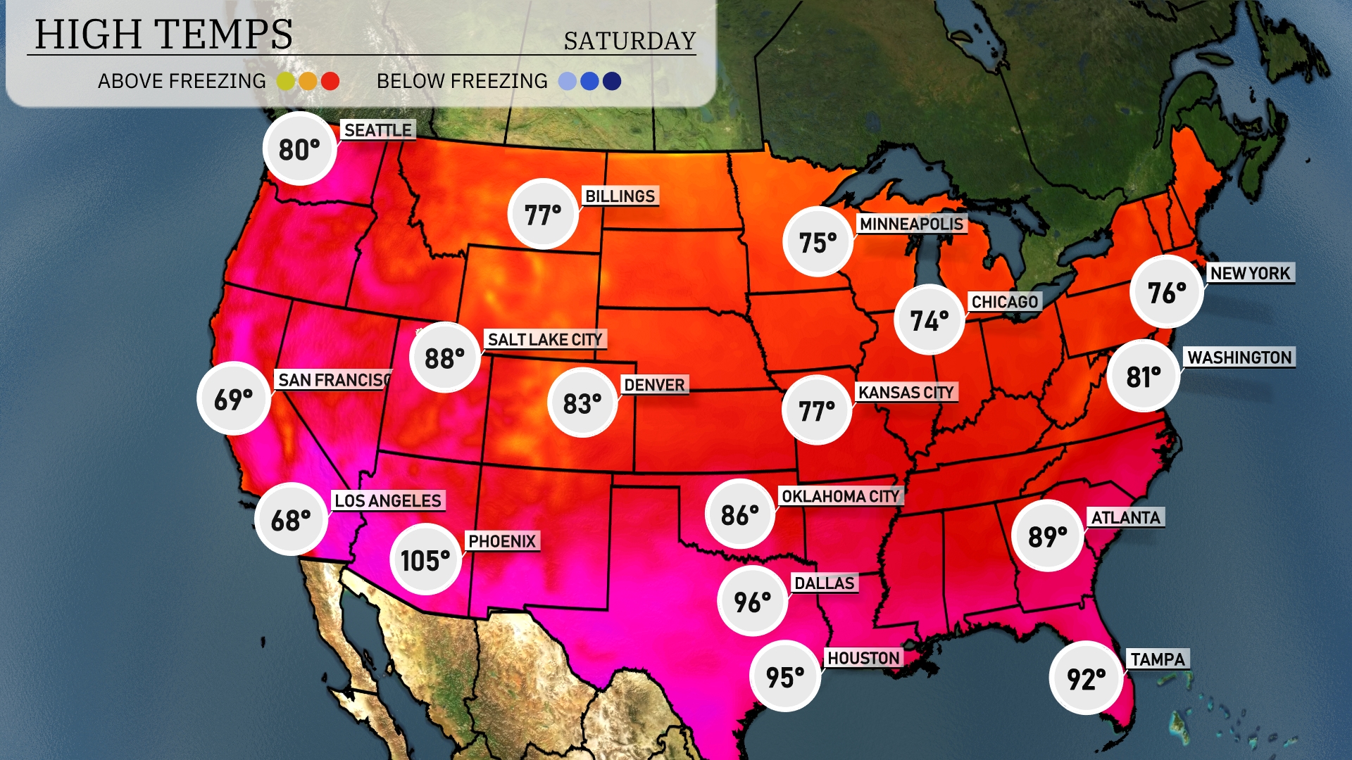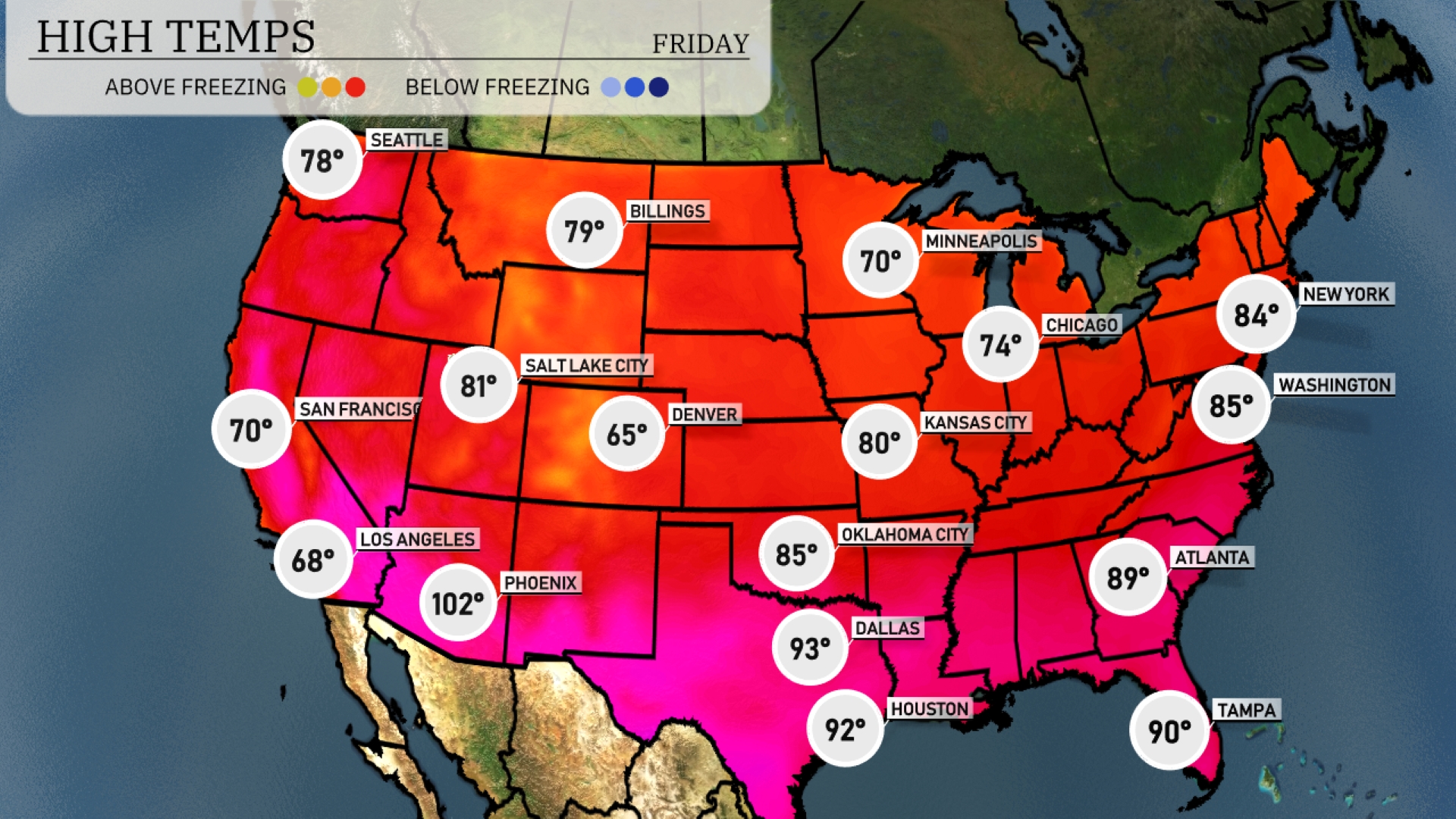 Today, the Southwest is feeling the heat with Phoenix sizzling at 102 degrees, significantly warmer than its neighboring cities. Over in Texas, Dallas reaches a warm 93 degrees, while Houston stays close behind at 92. In contrast, the Northeast remains relatively mild, with New York hitting 84 and Washington, D.C. just a notch warmer at 85 degrees. The Midwest sees a cooler high of 74 in Chicago, while Kansas City lags slightly behind at 80.