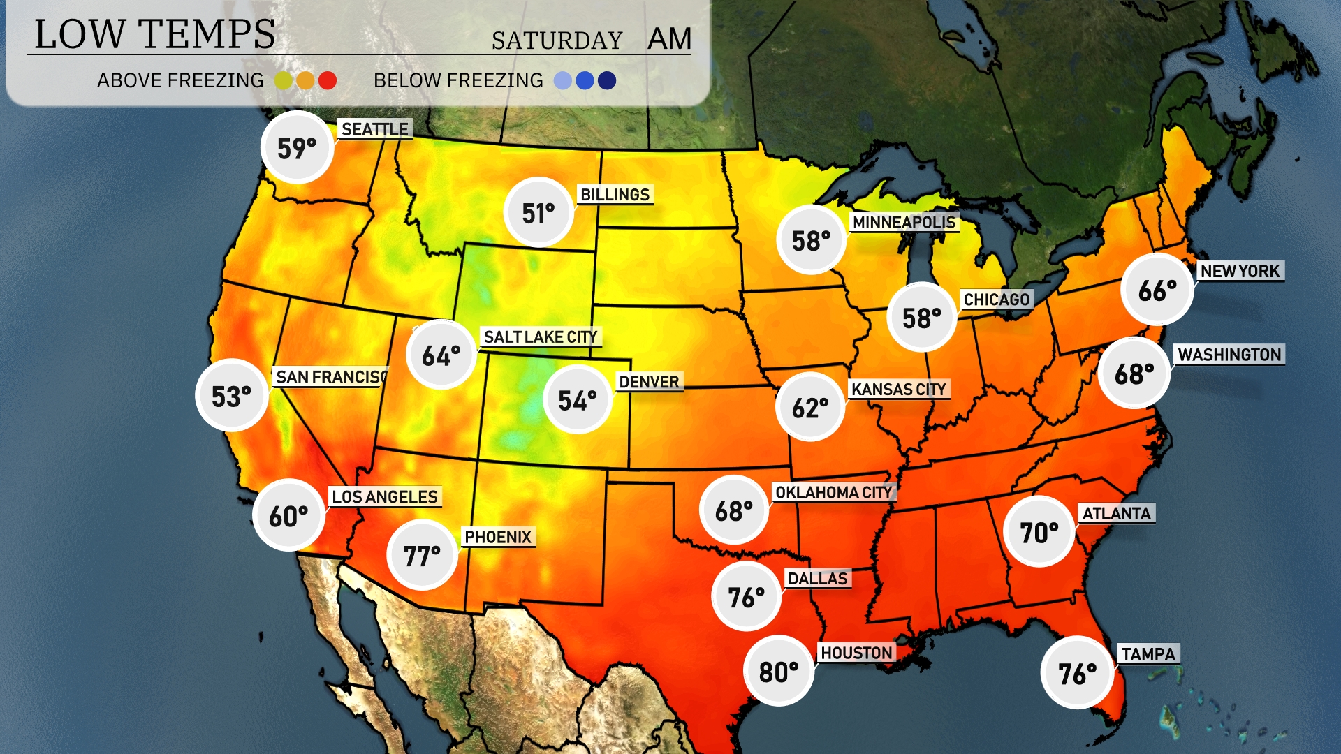 Now for the low temperatures tomorrow morning across the U.S. In the Midwest, Minneapolis will chill down to 58 degrees, while Chicago is forecasted at 58 as well. Heading to the South, Atlanta will wake up to 70 degrees, with warmer temperatures in Dallas at 76 and Houston at a more humid 80 degrees. Out west, Denver will cool to 54 degrees, while Los Angeles holds steady at 60 degrees, creating varied conditions across the nation.