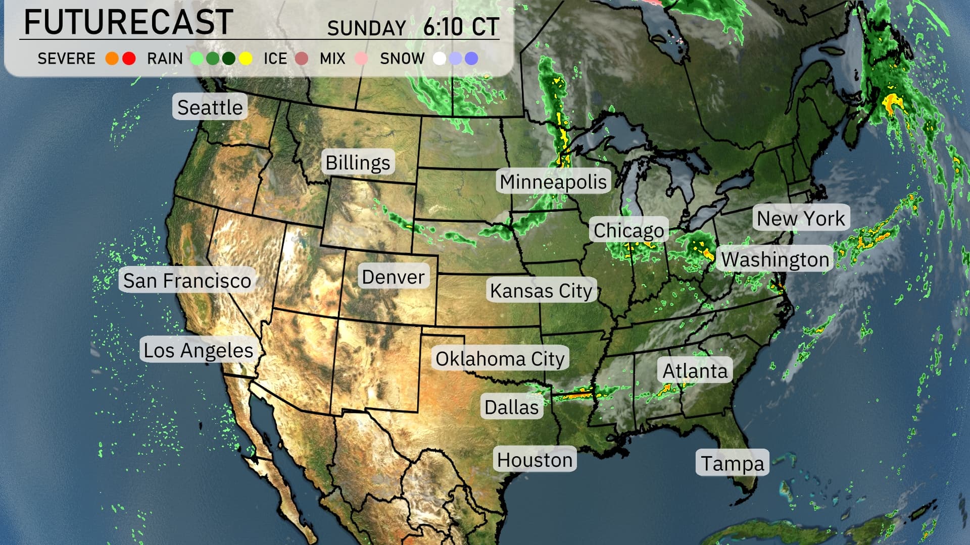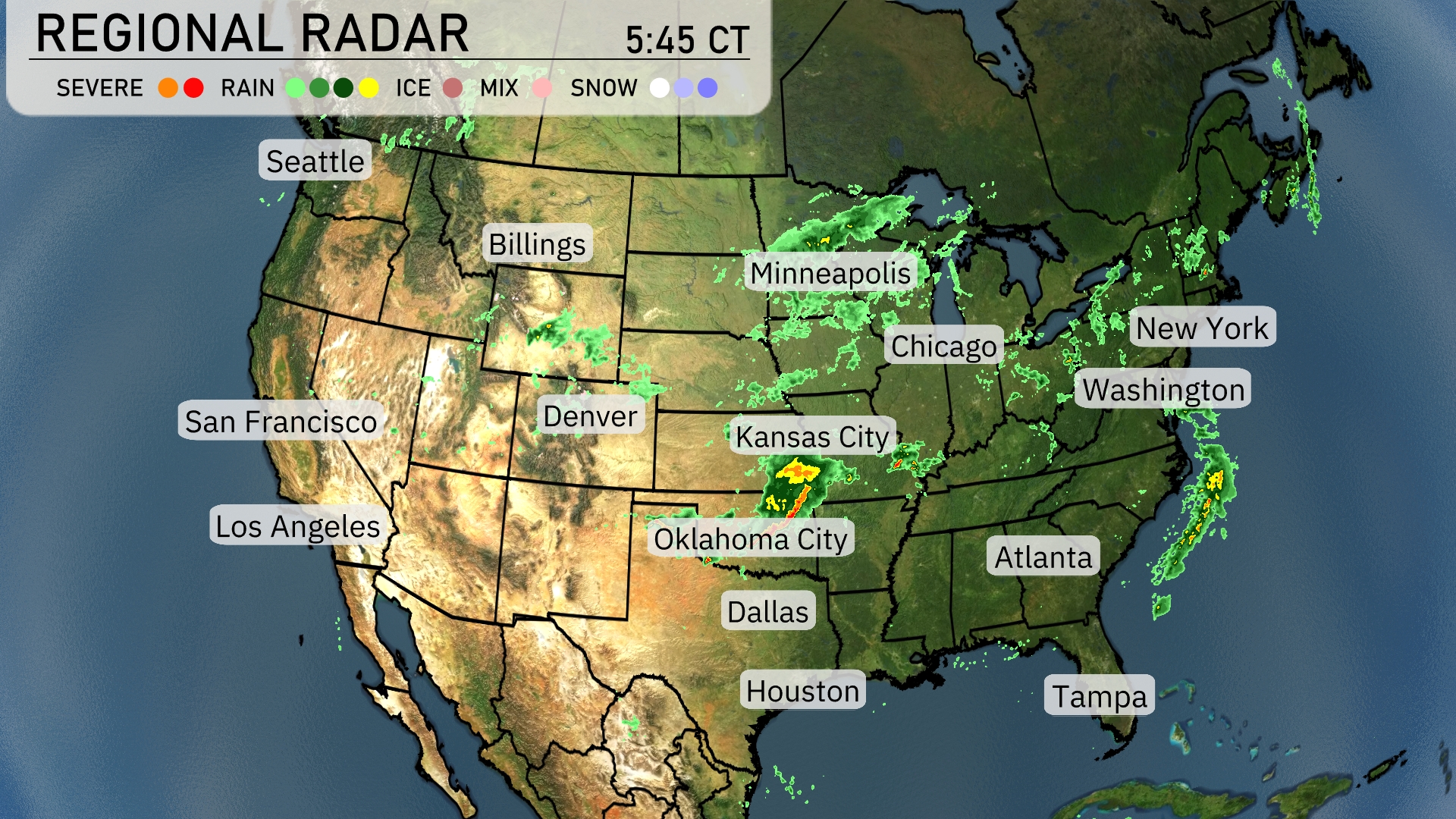 A potent storm system is sweeping through the central U.S., bringing a mix of rain and thunderstorms from Oklahoma City to Kansas City, with potential severe weather impacts, including strong winds and heavy downpours. In the Midwest, areas around Minneapolis and Chicago should prepare for rainy conditions, as cooler air settles in behind the frontal passage. The East Coast, from New York to Washington, is set for steady rain that could affect visibility and travel plans. Out West, Los Angeles enjoys dry and sunny weather, while intermittent showers bring moisture to Seattle and the Pacific Northwest region.