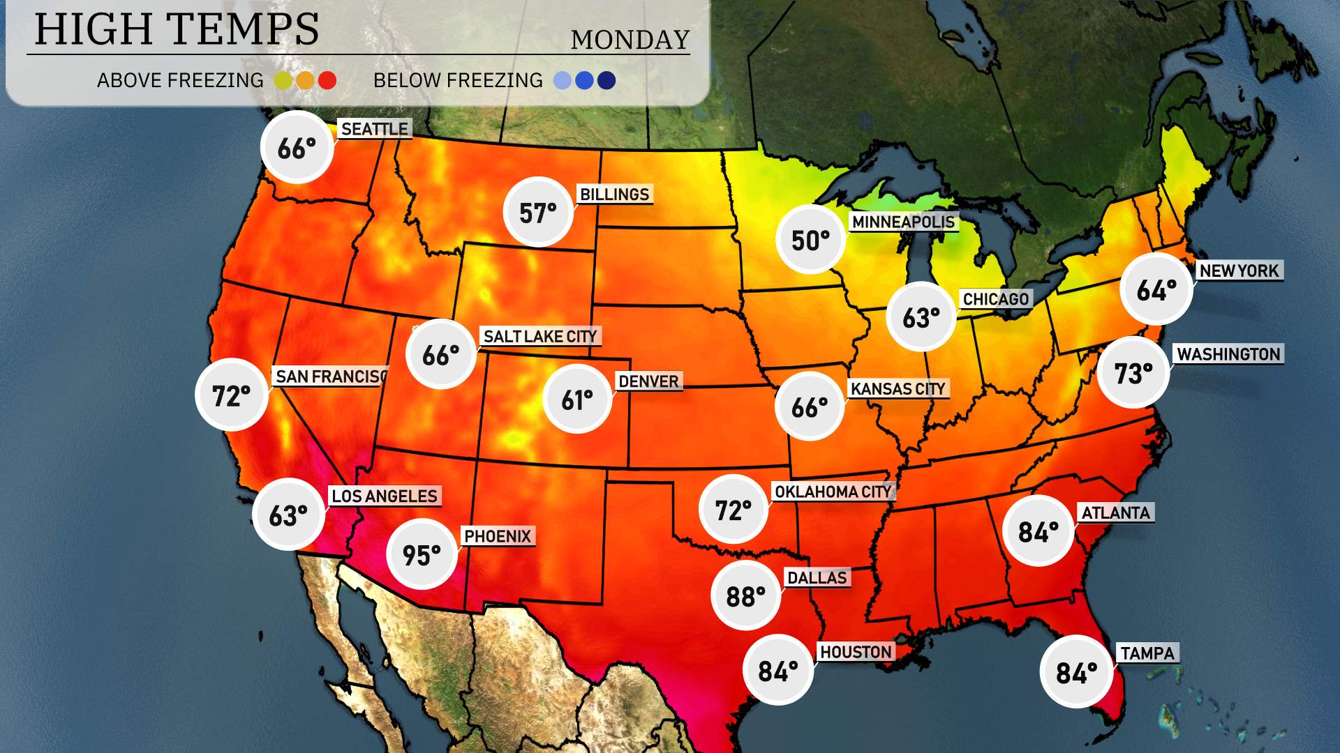 On the West Coast, Los Angeles sees a high of 63 degrees, while San Francisco is not much warmer at 72. In Phoenix, we’re looking at a hot 95 degrees.