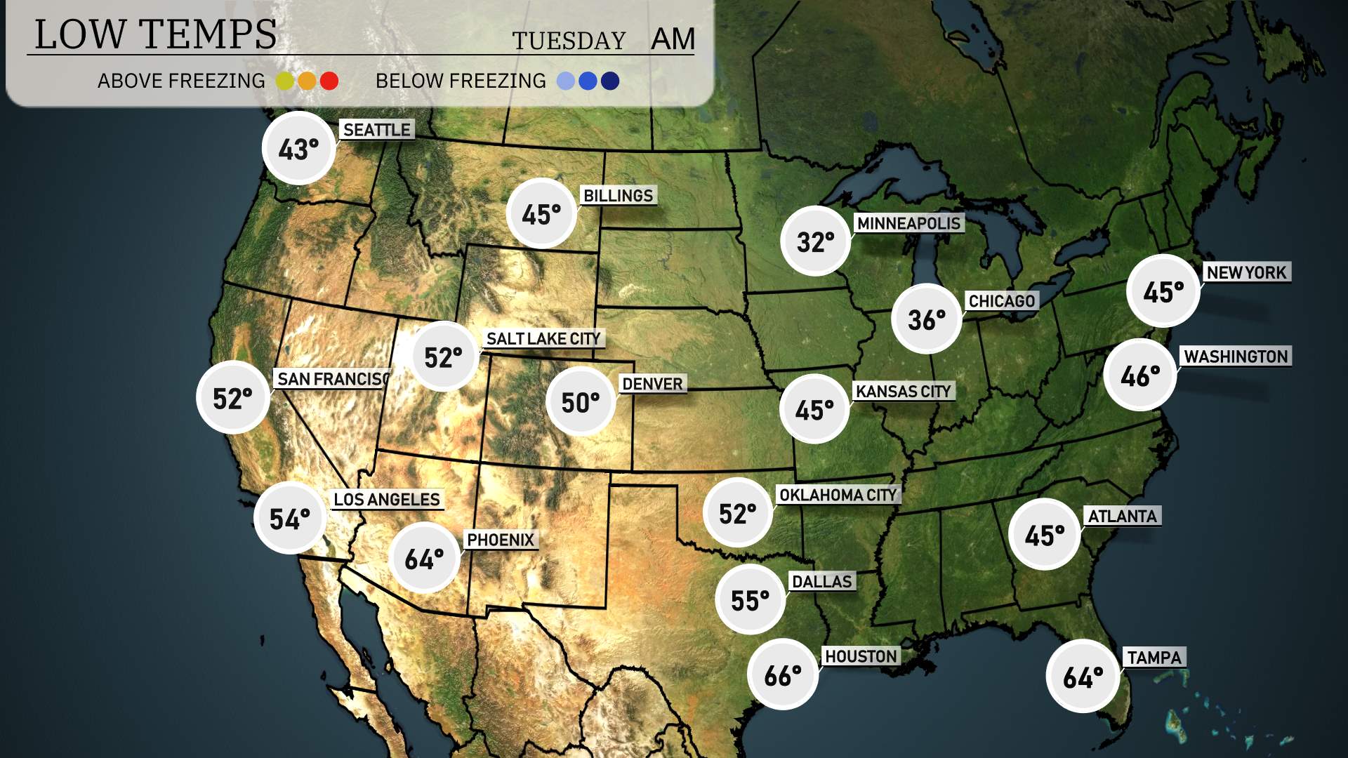 Billings has a low of 45 degrees, and Denver is cool at 50 degrees. Out west, Salt Lake City is forecast to dip to 52 degrees.