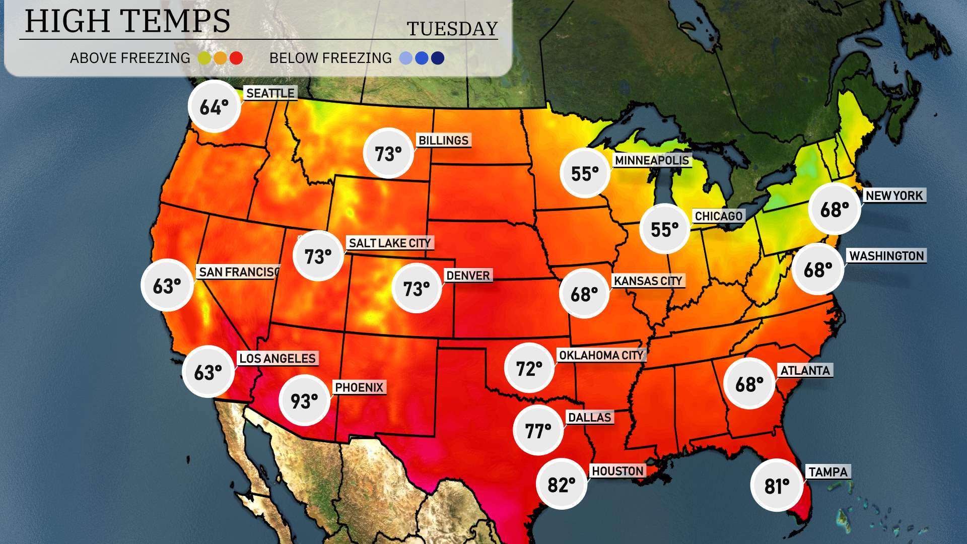 Phoenix is also feeling the heat with a forecasted high of 93 degrees. Salt Lake City and Denver will enjoy pleasant highs of 73 degrees.