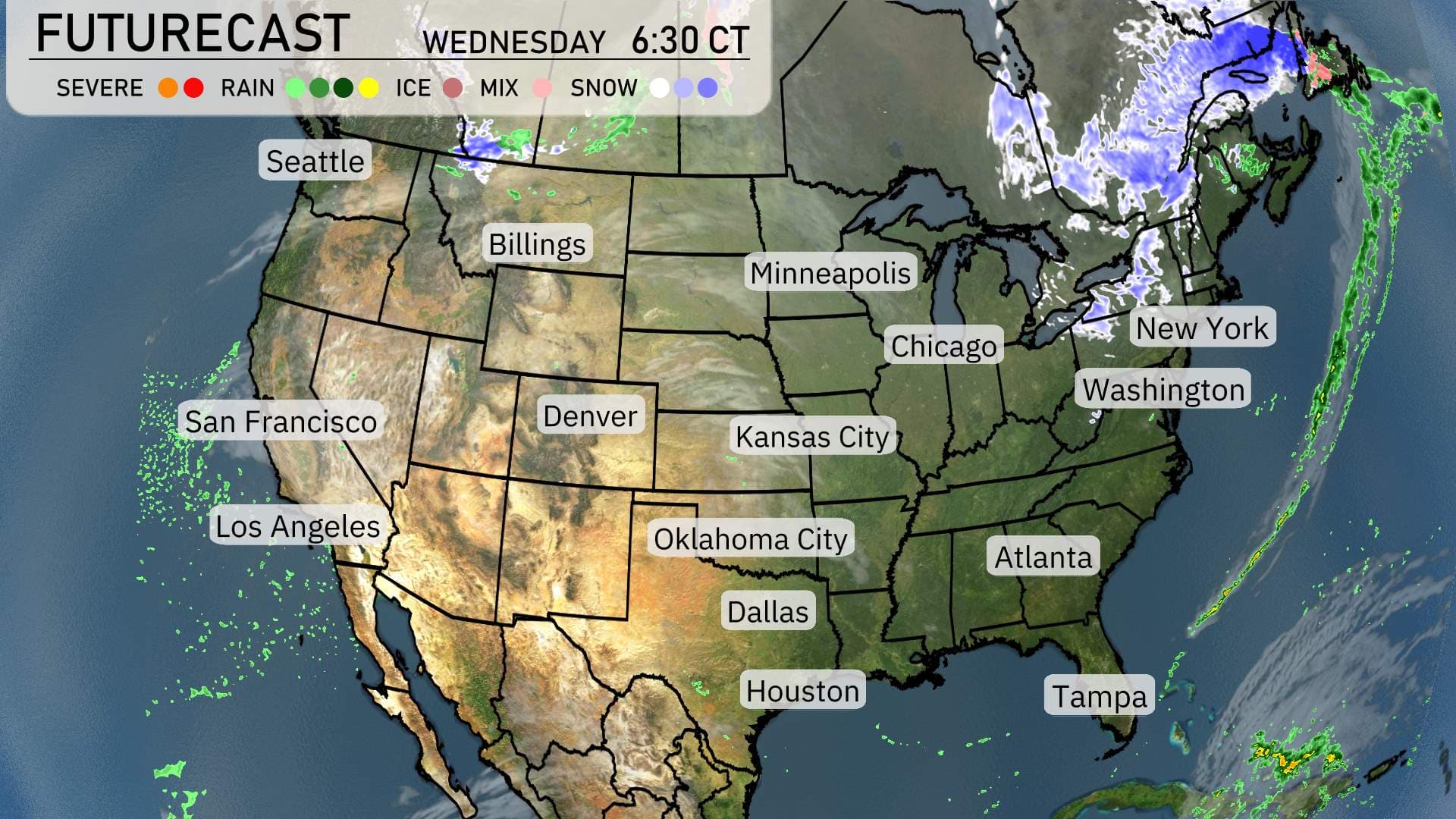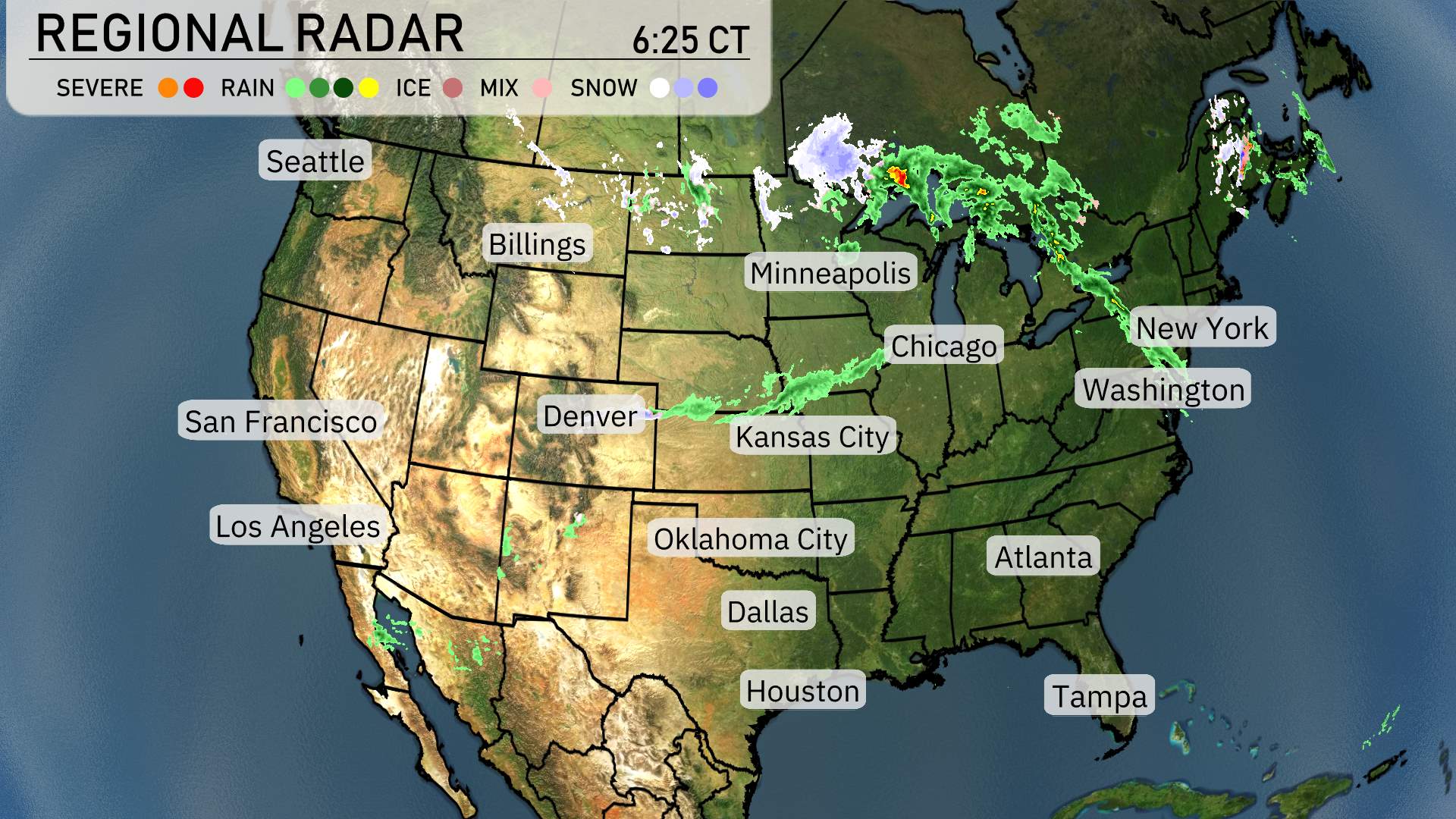 Meteorologist Amy Freeze delivers a sweeping view of today’s U.S. weather—from severe storms in the East to sunny spells in the South and heating up in the West.
