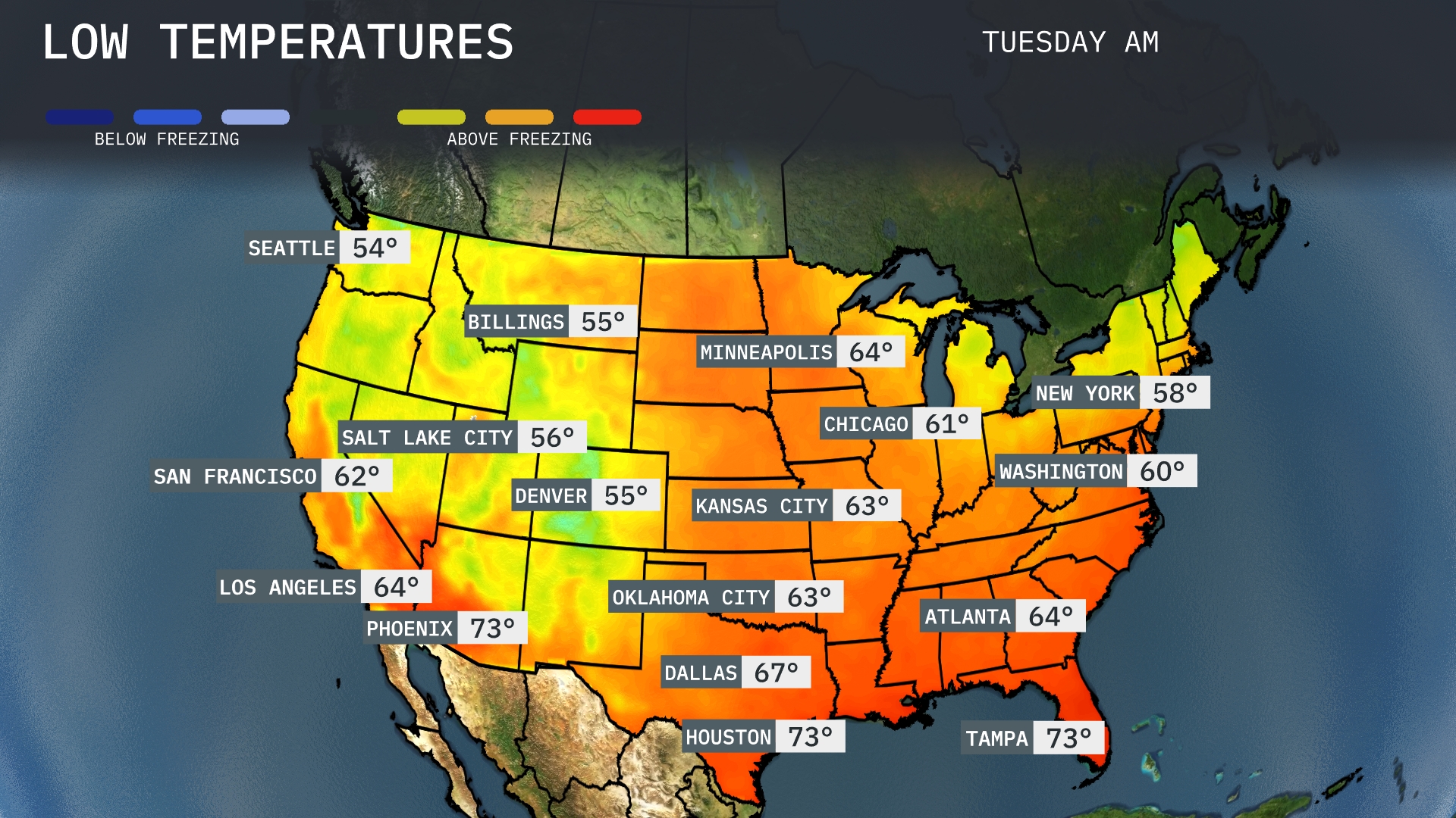 Now for the low temperatures tomorrow morning across the U.S. The Midwest is waking up cold, with Minneapolis dropping to 64 degrees and Chicago a bit cooler at 61. In the Southeast, Atlanta starts the day at a mild 64 degrees, while New York will see a low of 58 degrees. Out West, both Denver and Salt Lake City will experience lows of 55 degrees and 56 degrees, respectively, making it a chilly start in those regions.