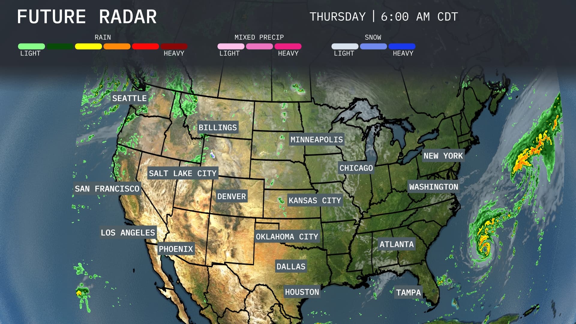 From the Pacific Northwest, Seattle is experiencing moderate rain, which extends farther down into Northern California around San Francisco. The heaviest precipitation today is impacting areas near Miami, where storms could potentially disrupt local activities and travel.