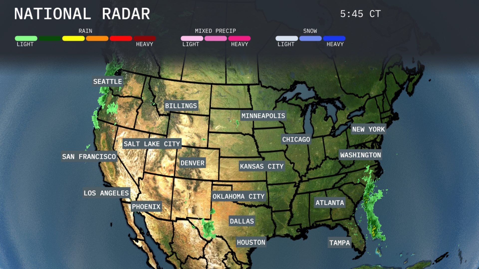 In the Midwest, some light rain showers are present around Chicago and stretching towards Minneapolis, contributing to a damp day. Across the Southern Plains, Dallas remains dry with clear skies, while the Southwest, including Phoenix and Los Angeles, enjoys sunshine.