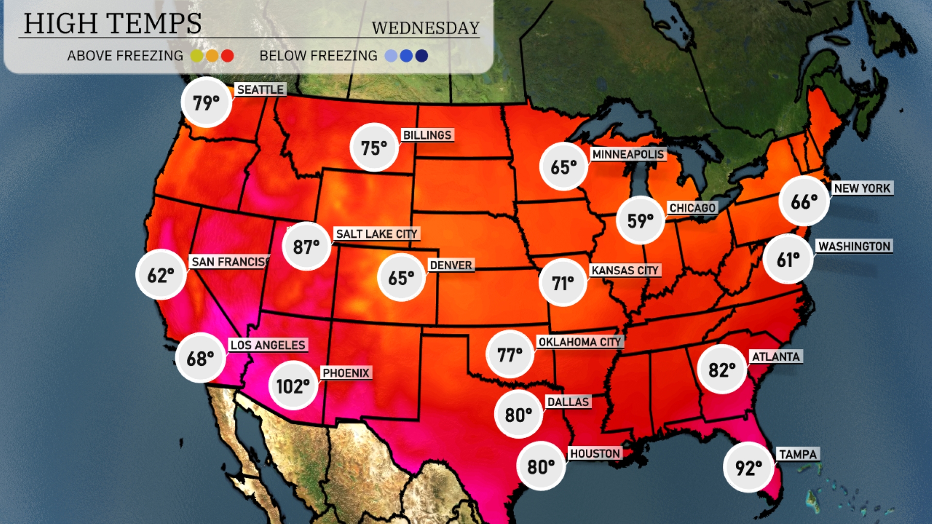 Today’s high temperatures across the country show notable contrasts. In the East, Atlanta warms up to a pleasant 82 degrees, while much cooler air lingers in Washington, D.C. with a high of 61 degrees. Heading west, the heat intensifies in Phoenix, where temperatures soar to a blistering 102 degrees, making it the hottest spot today. Meanwhile, Los Angeles experiences mild conditions with a high of 68 degrees. Up in Denver, expect a cooler 65 degrees, contrasting sharply with the warmth in southern states.