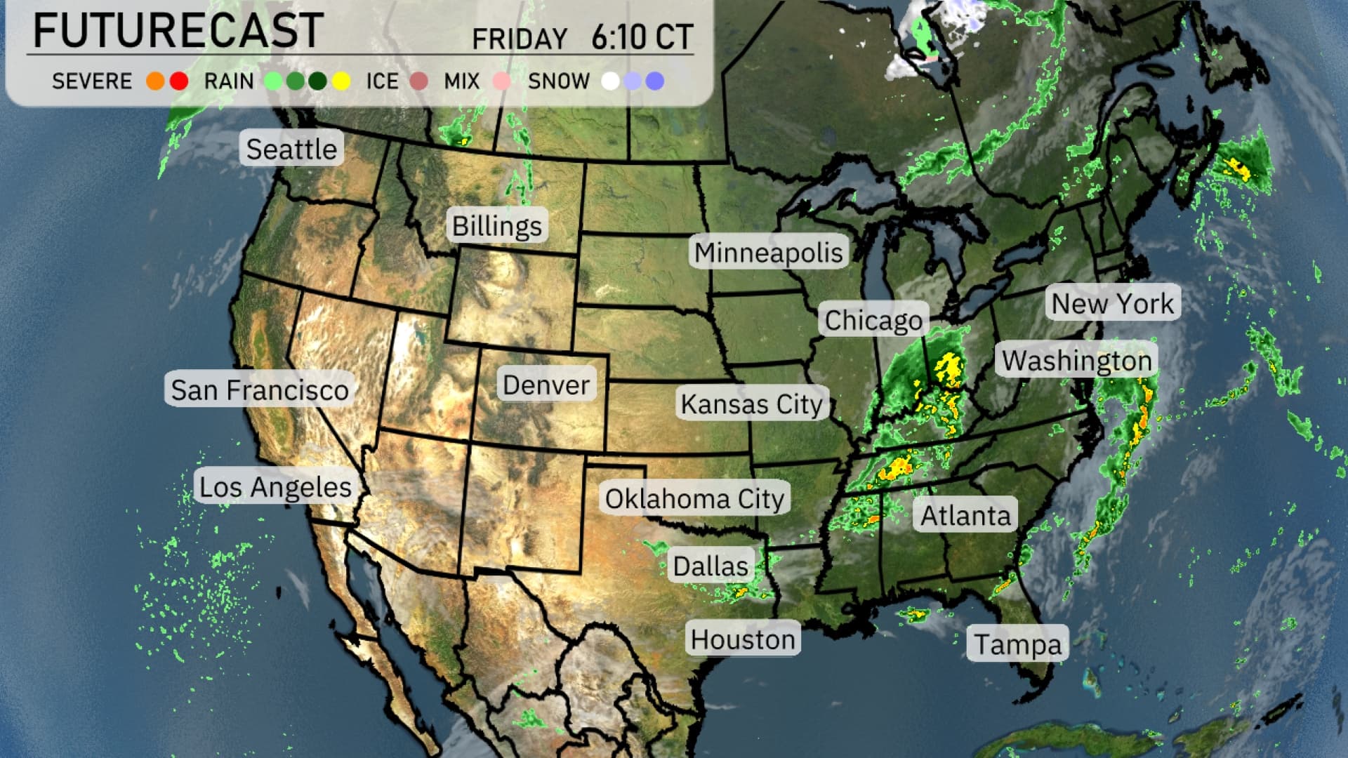 Farther south, Texas is experiencing the heaviest impact. Houston faces severe thunderstorms, fueling concerns for localized flooding and travel disruptions. Farther inland, Oklahoma City is seeing lighter showers moving through, while Dallas is clear for now but should remain alert for changing conditions.